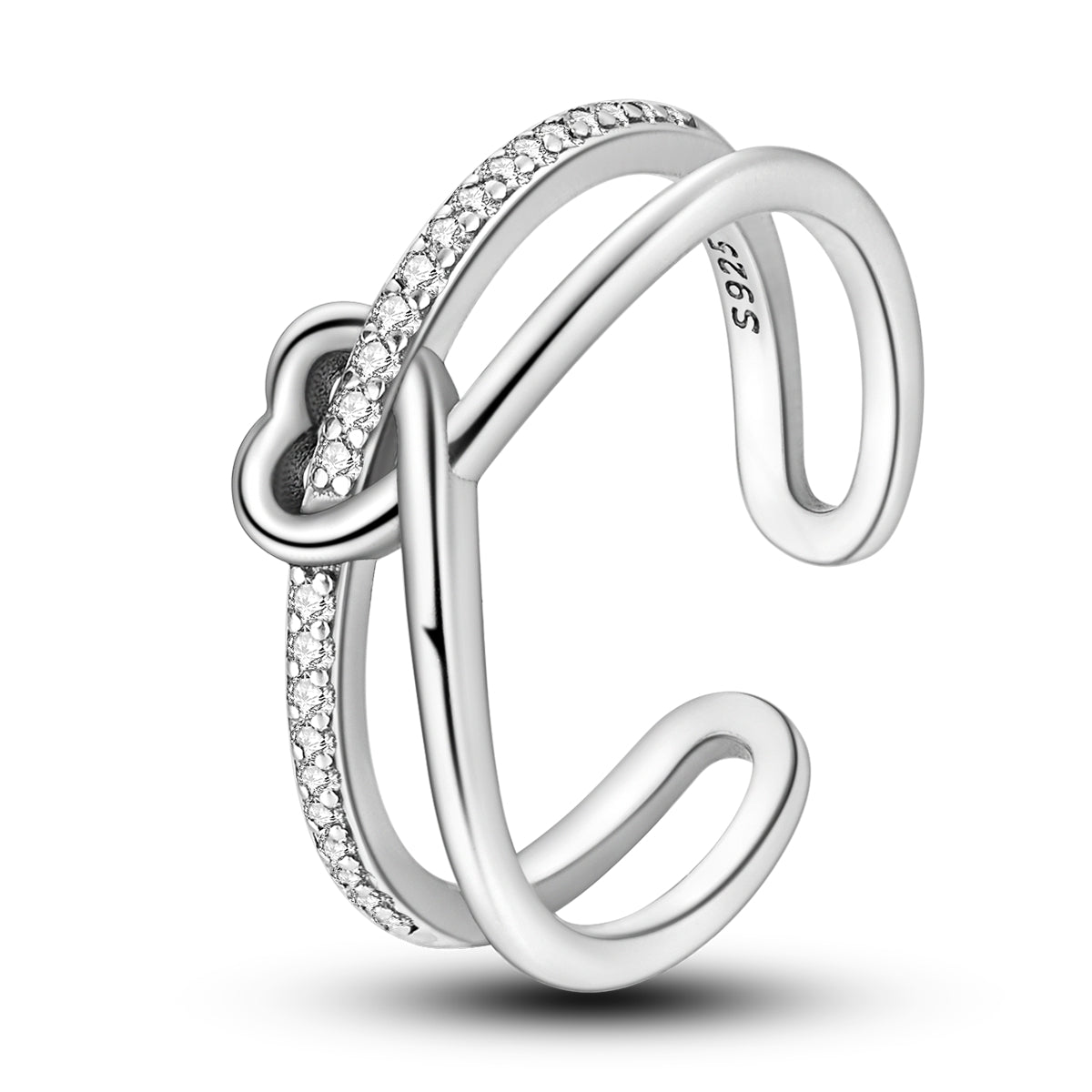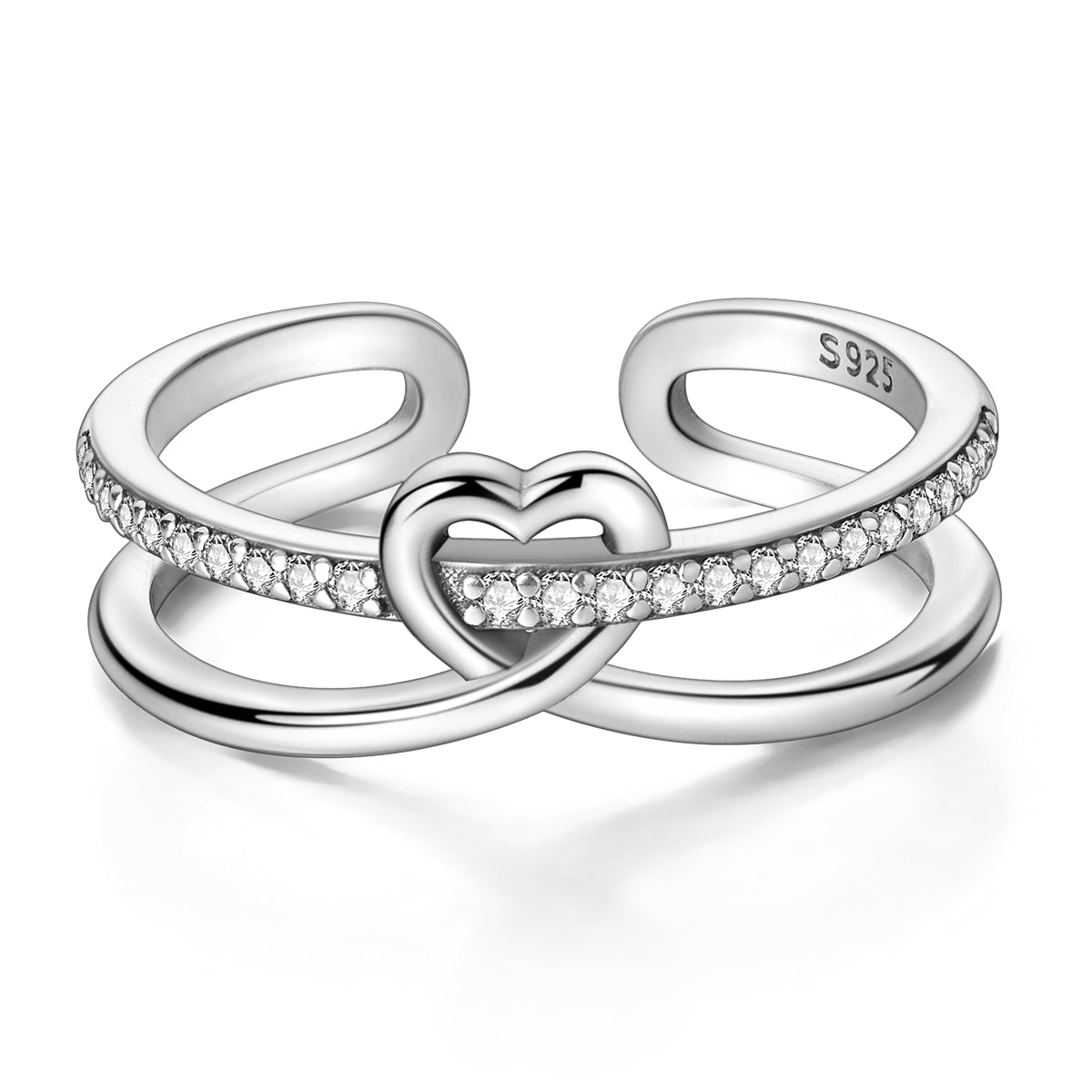 Kalp formu sevgi ve bağı simgeler. Açık form tasarımı sayesinde ayarlanabilir yapı sunar ve parmağa rahatça uyum sağlar. Işıltılı taş dizilimi, sade çizgilerle dengelenerek günlük kullanıma uygun bir şıklık yaratır. 925 ayar gümüşten üretilmiştir.