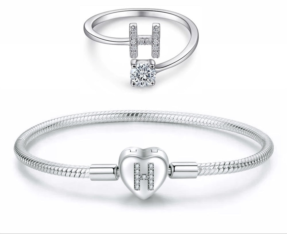 H Harfi Kadın Gümüş Charm Bileklik ve Yüzük