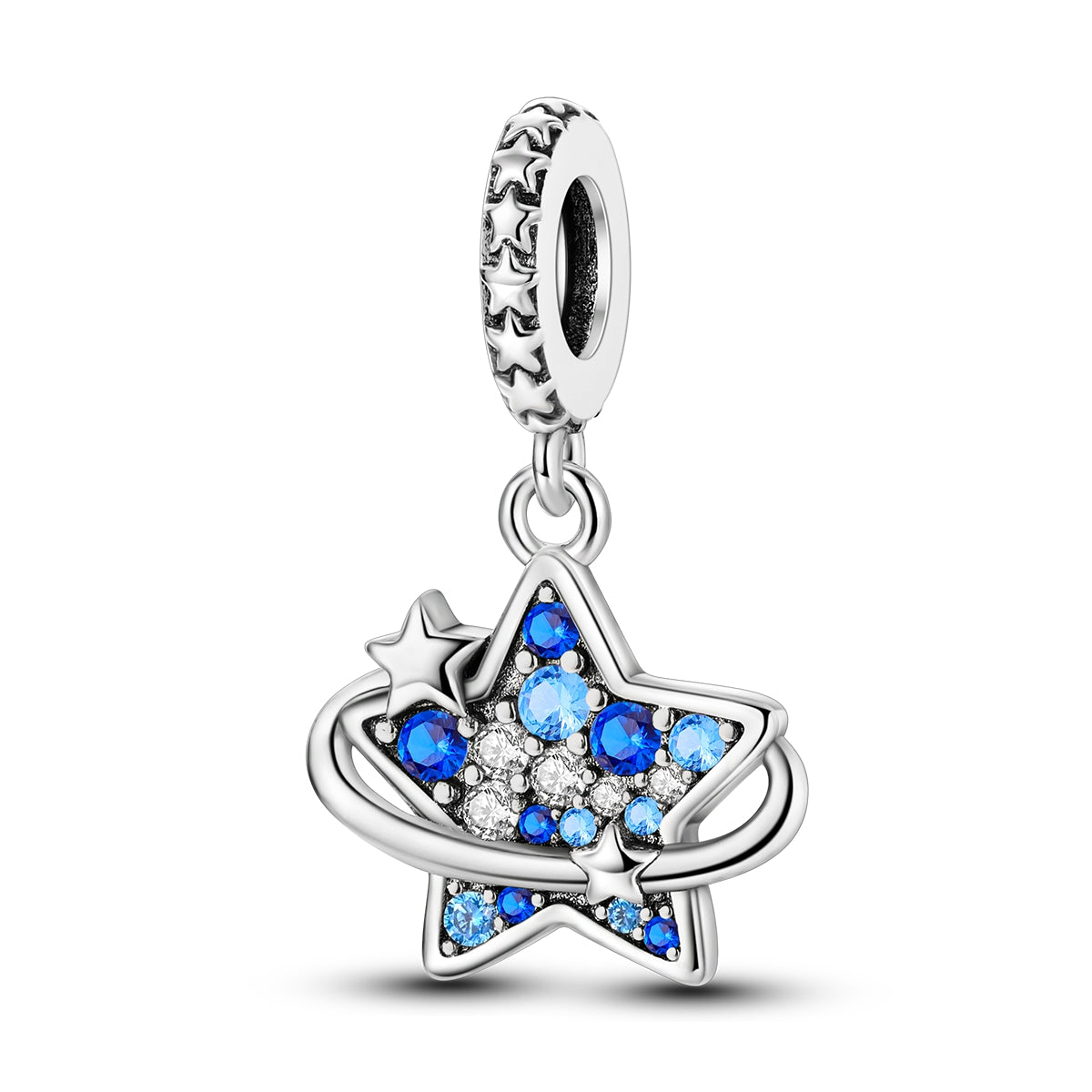 Gökyüzünün ışıltısından ilham alan bu sallantılı charm, merkezde yer alan yıldız formu ve onu çevreleyen halka detayıyla hayalleri ve umutları simgeler. Mavi ve şeffaf taş süslemeleri tasarıma derinlik ve zarif bir parlaklık katarken, hareketli yapısı bileklikte dikkat çekici bir görünüm oluşturur. 925 ayar gümüşten üretilen bu sallantılı charm, kendi yolunu çizerken ışığını takip etmeyi hatırlatan anlamlı bir seçimdir.