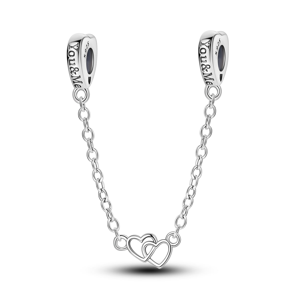 Birbirine kenetlenmiş iki kalp figürüyle tasarlanan bu güvenlik zinciri charm, bağlılığı ve paylaşılan anları simgeler. Zarif zincir yapısı, bileklikteki charmların güvenle sabitlenmesini sağlarken romantik bir dokunuş sunar. Sade ve zamansız tasarımı sayesinde günlük kombinlere kolayca uyum sağlar. 925 ayar gümüşten üretilmiştir.