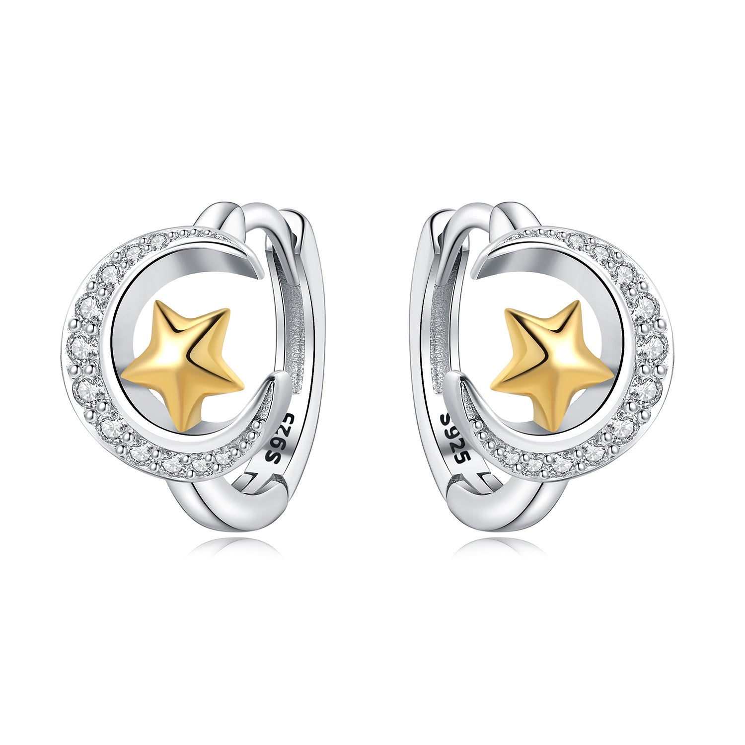 Ortadaki yıldız detayı ve çevresini saran taşlı çerçevesiyle modern bir ışıltı sunan bu halka küpe, güçlü bir sembolü zarif bir tasarımla buluşturur. Işığı yakalayan taş dizilimi kulakta dengeli ve dikkat çekici bir görünüm oluştururken, altın tonlu yıldız detayı tasarıma sıcak bir kontrast katar. Günlük kombinlere modern bir dokunuş, özel anlara ise anlamlı bir ışıltı ekleyen bu tasarım 925 ayar gümüşten üretilmiştir.