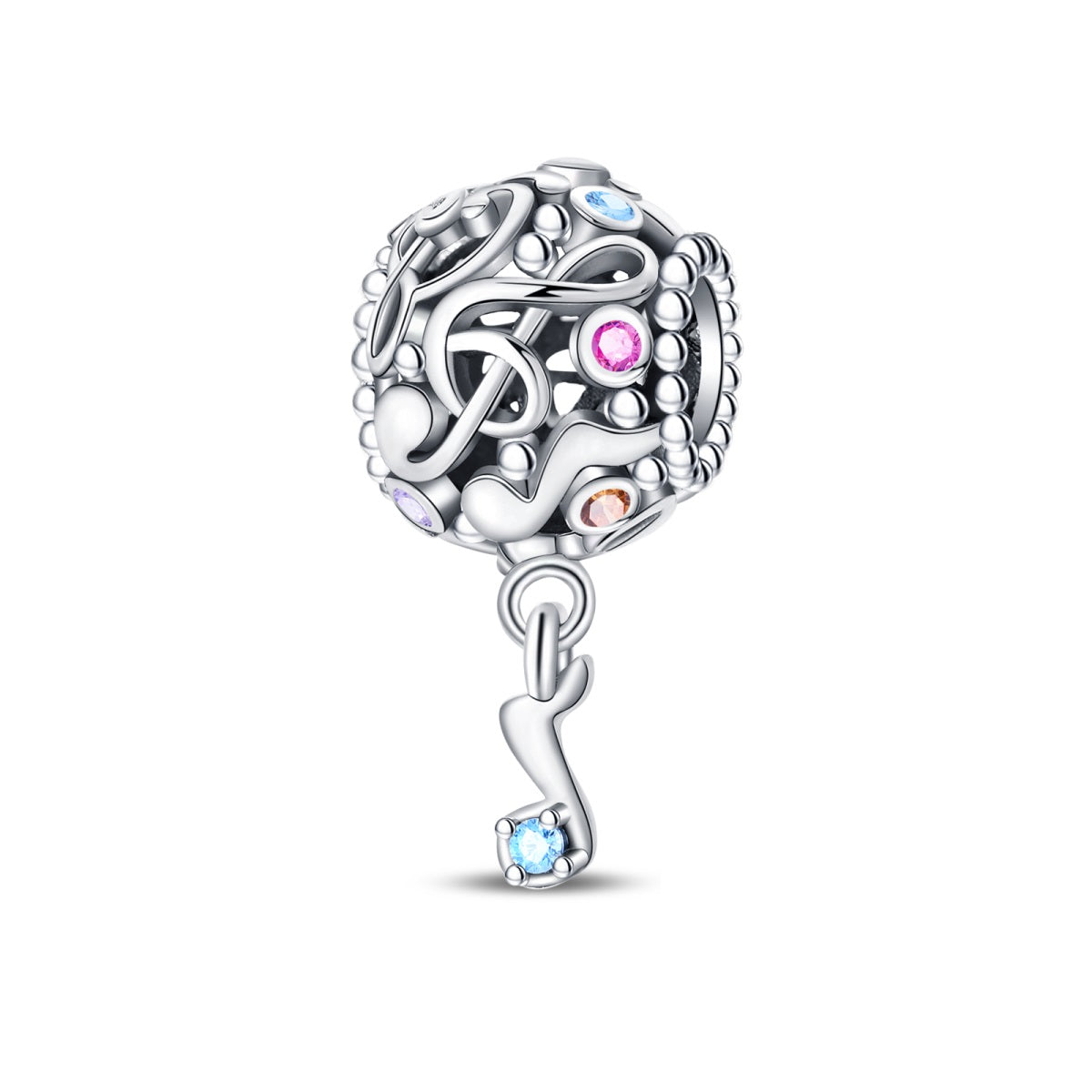Müziğin ritmini ve zarafetini tek bir tasarımda buluşturan bu sallantılı charm, 925 ayar gümüşten üretildi. Yuvarlak gövde üzerindeki akışkan nota detayları müziğin hareketini simgelerken, renkli taş dokunuşları tasarıma canlı bir ışıltı katar. Alt kısmında yer alan sallantılı nota figürü her hareketle birlikte müziğin enerjisini yansıtır. Zamansız ve anlamlı tasarımıyla bu özel parça, müziği hayatının vazgeçilmez bir parçası olarak görenler için ideal bir seçimdir.