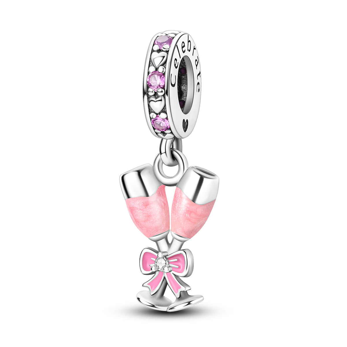 Birbirine dokunan pembe şampanya kadehlerinden ilham alan bu sallantılı charm, kutlamayı, birlikteliği ve paylaşılan özel anları simgeler. Kadehlerin alt kısmındaki fiyonk detayı, zarif bir bağ ve anlamlı anların hatırasını temsil eder. Pembe tonlar ve ışıltılı taşlarla tamamlanan tasarım, neşeli ve romantik duyguları yansıtan özel bir sembol sunar. Tasarımında kullanılan 925 ayar gümüş, figüre kalıcı ve zarif bir görünüm kazandırır.