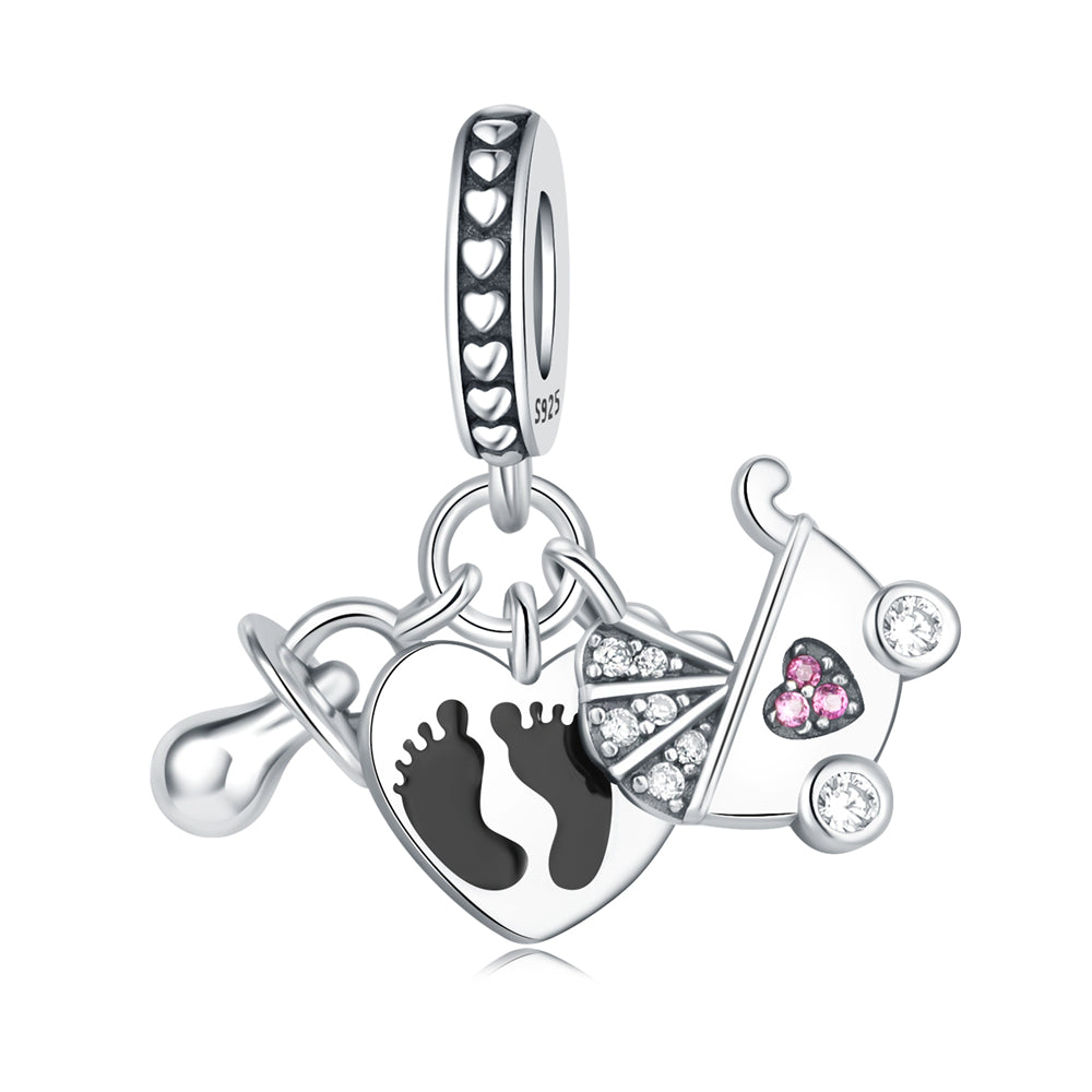 Yeni bir başlangıcın ve koşulsuz sevginin simgesi olan bu sallantılı charm, ebeveynlik yolculuğunun en özel anlarını temsil eder. Kalp formundaki parçada yer alan bebek ayak izi detayı, hayata yeni gelen bir mucizeyi simgeler. Yanındaki sallantılı bebek arabası figürü ise bu anlamı tamamlar. 925 ayar gümüşten üretilen bu tasarım, parlak taş detaylarıyla zarif bir dokunuş kazanır. Aileye katılan yeni bir üyeyi veya unutulmaz bir anıyı her zaman yanında taşımak için idealdir.
