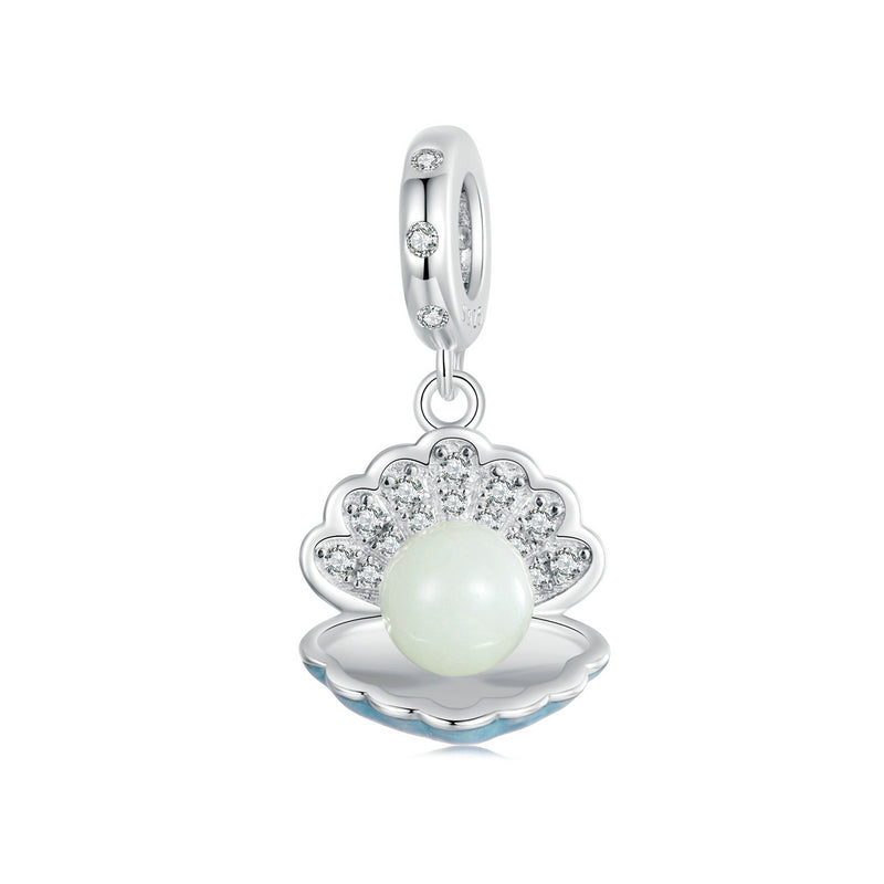Bu zarif gümüş charm, açık bir midye kabuğu içinde parlayan bir inci ve etrafını çevreleyen kristal taşlarla süslenmiştir. Deniz temalı bu aksesuar, bilekliklere veya kolyelere kolayca eklenebilir. Şık tasarımı ve göz alıcı detaylarıyla, doğanın güzelliğini yansıtan mükemmel bir hediye seçeneği sunar