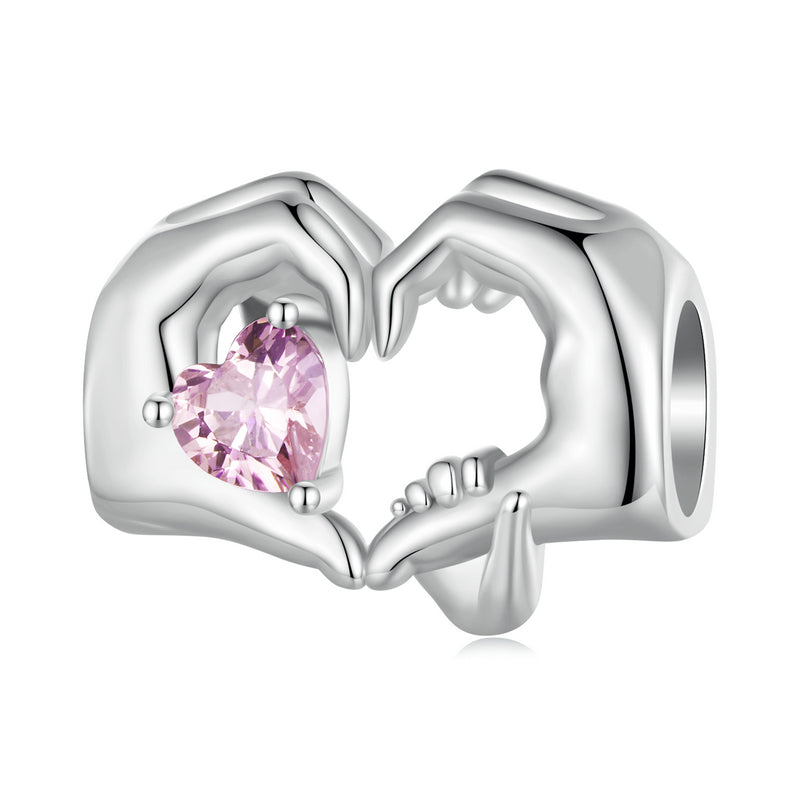 İki elin birleşerek oluşturduğu kalp figürüyle sevgi ve bağlılığı simgeleyen bu özel charm, zarif detaylarıyla öne çıkıyor. Kalbin merkezini süsleyen ışıltılı pembe taş, sevginizin sıcaklığını ve içtenliğini yansıtıyor. 925 ayar gümüşten üretilen bu anlam yüklü tasarım, bileklik ve kolyelerinize duygusal bir dokunuş katacak.