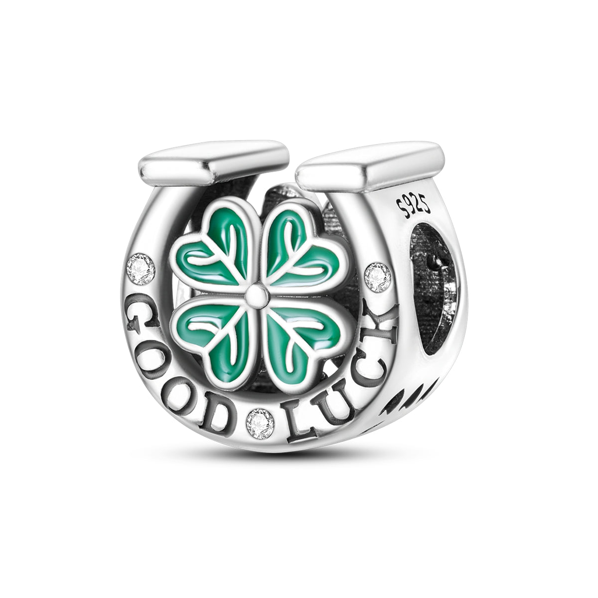 925 ayar gümüşten üretilen tasarımda yer alan dört yapraklı yonca, yeşil renkli taş detayıyla öne çıkarken; at nalı formu zarif bir denge unsuru oluşturur.