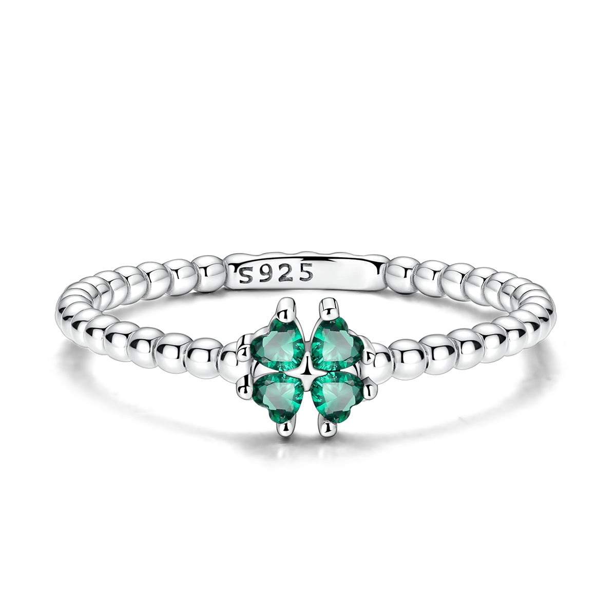 925 ayar gümüşten üretilen bu yüzük, dört yaprak yonca formundaki yeşil taşlarıyla şansı, umudu ve iyi dilekleri simgeler; boncuk detaylı yüzük bandı tasarıma yumuşak bir hareket kazandırırken, günlük kullanımda anlamını zarif bir şekilde yansıtmak isteyenler için zamansız bir seçim sunar.